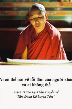 "...khi người bình phàm nói về lỗi lầm của người khác, bạn đang không làm vậy vì lòng bi mẫn vị tha mà thay vào đó, chỉ bởi những cảm xúc phiền não của chính bạn. Cả hai sẽ phá hủy cội nguồn công đức của bạn và làm sâu sắc thêm thiên kiến của bạn với người khác. Nó giống như sương giá của những chướng ngại bao trùm mùa màng của sự hành trì và cũng sẽ gieo mối bất hòa ngăn cản sự hòa hợp trong Tăng đoàn. Hành vi như vậy chẳng đem lại lợi lạc nào, với cả bạn hay người khác."