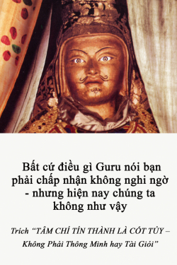 "Để đạt tới cái kiến cao như vậy, trước hết cần tu pháp Guru Yoga nhiều, nhằm nuôi dưỡng tâm tín thành kiên định, mạnh mẽ, bất thối chuyển và chân thực đối với Guru. Có nghĩa là bất cứ điều gì Guru nói bạn phải chấp nhận, không một nghi ngờ nào cả. Không có ý nghĩ thứ hai. Chỉ nói “Vâng” với bất cứ điều gì Guru nói."