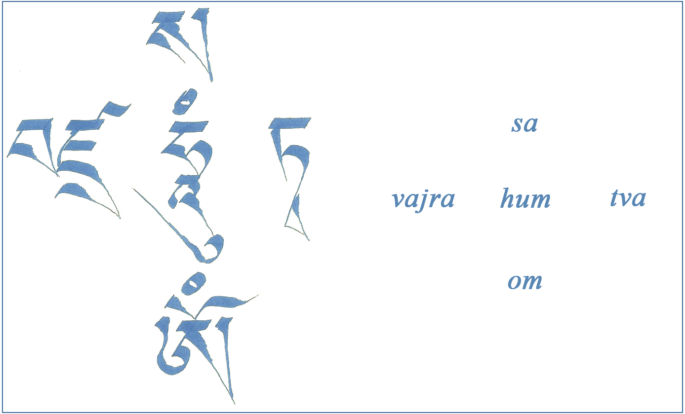 Đính chính: Xin quý độc giả tham khảo bản thư pháp của Ngài Hungkar Dorje Rinpoche để quán tưởng đúng vị trí các chủng tự. BBT LHQ đã hỏi Ngài về bản vẽ các chủng tự trong cuốn Lời Vàng Của Thầy Tôi (bản dịch Tạng Anh và bản dịch Tạng Việt). Ngài nói hai bản vẽ này đều sai. Hình vẽ trong bản gốc tiếng Tạng giống với bản thư pháp của Rinpoche.