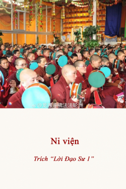Vào thời xưa ở Golog không có ni viện. Người ta thường xem thường phụ nữ thậm chí đối với cả những người đã thọ giới xuất gia. Theo tôi đó là một điều không thể hiểu nổi: tại sao phụ nữ nói chung và ni sư nói riêng không được tôn trọng. Vì vậy tôi đã thành lập một ni viện. Đó là ni viện đầu tiên ở Golog và được đánh giá cao xét về phương diện giới luật thanh tịnh. Các ni sư ở đây rất khiêm tốn. Họ giữ giới luật như giữ gìn con ngươi của mắt mình và trên nền tảng căn bản này họ ngày càng có nhiều cơ duyên để học giáo lý và những ngành tri thức khác nhau.
