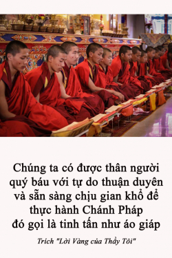 Chúng ta có được thân người quý báu với tự do thuận duyên và sẵn sàng chịu gian khổ để thực hành Chánh Pháp đó gọi là tinh tấn như áo giáp