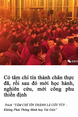 Tất nhiên việc học tập là rất quan trọng nhưng tâm chí tín thành còn quan trọng hơn. Khi có tâm chí tín thành thì văn, tư, tu và tất cả mọi thứ đều quan trọng; bởi vì [khi đó] tất cả mọi thứ trở nên rất lợi lạc và hiệu quả. Còn khi bạn không có tâm chí tín thành thì việc văn, tư, tu của bạn là rỗng tuếch, chỉ là hình tướng bên ngoài, không có mấy lợi lạc. Vì vậy, chúng ta phải nỗ lực để trước hết có lòng tin, trước hết có tâm chí tín thành chân thực đã, rồi sau đó mới học hành, nghiên cứu, mới công phu thiền định.