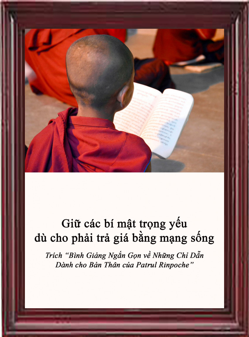 “Đừng tiết lộ bí mật cho bất kỳ ai” đòi hỏi chúng ta phải giữ các bí mật. Các giáo lý về Mật thừa trong Diệu Huyễn Võng (Guhyagarbha Mayajala) giải thích rất chi tiết về bí mật nào có thể được chia sẻ với chư đạo sư và bí mật nào có thể được chia sẻ với huynh đệ kim cương. Những bí mật này, chẳng hạn trạng thái chứng ngộ và các giới luật giữa những huynh đệ kim cương, cần được giữ bí mật hoàn toàn, nếu không Mật giới sẽ bị bẻ gẫy. Kyabje Jigme Phuntsok Rinpoche từng nói: “Về các vấn đề quan trọng, chẳng hạn Bổn tôn của tôi, tôi không bao giờ nói chúng cho bất kỳ ai, kể cả những người thân thiết nhất”. Rất hiếm người có thể giữ bí mật, những điều không nên được phát lộ. Nếu bị lộ ra, mọi người đều sẽ biết và nó trở thành “bí mật mà ai cũng biết”. Tổ Sakya Pandita chỉ ra rằng, “Những bậc thượng căn không che giấu một cách không cần thiết, mà giữ các bí mật trọng yếu, dù cho phải trả giá bằng mạng sống”.