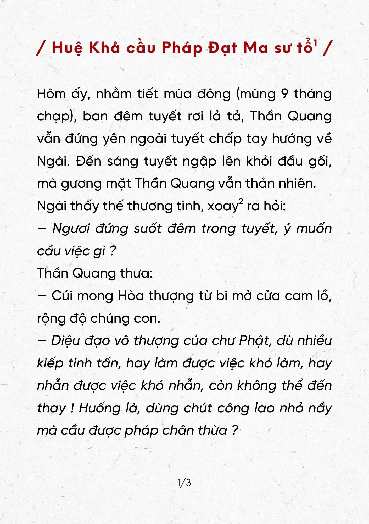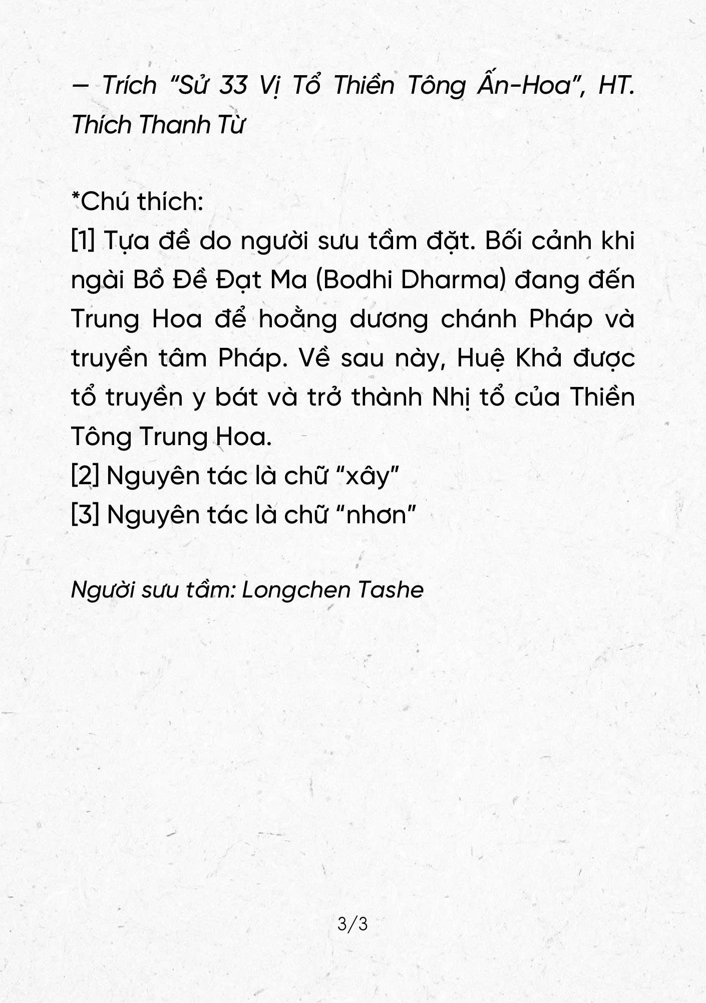 [1] Tựa đề do người sưu tầm đặt. Bối cảnh khi ngài Bồ Đề Đạt Ma (Bodhi Dharma) đang đến Trung Hoa để hoằng dương chánh Pháp và truyền tâm Pháp. Về sau này, Huệ Khả được tổ truyền y bát và trở thành Nhị tổ của Thiền Tông Trung Hoa.
