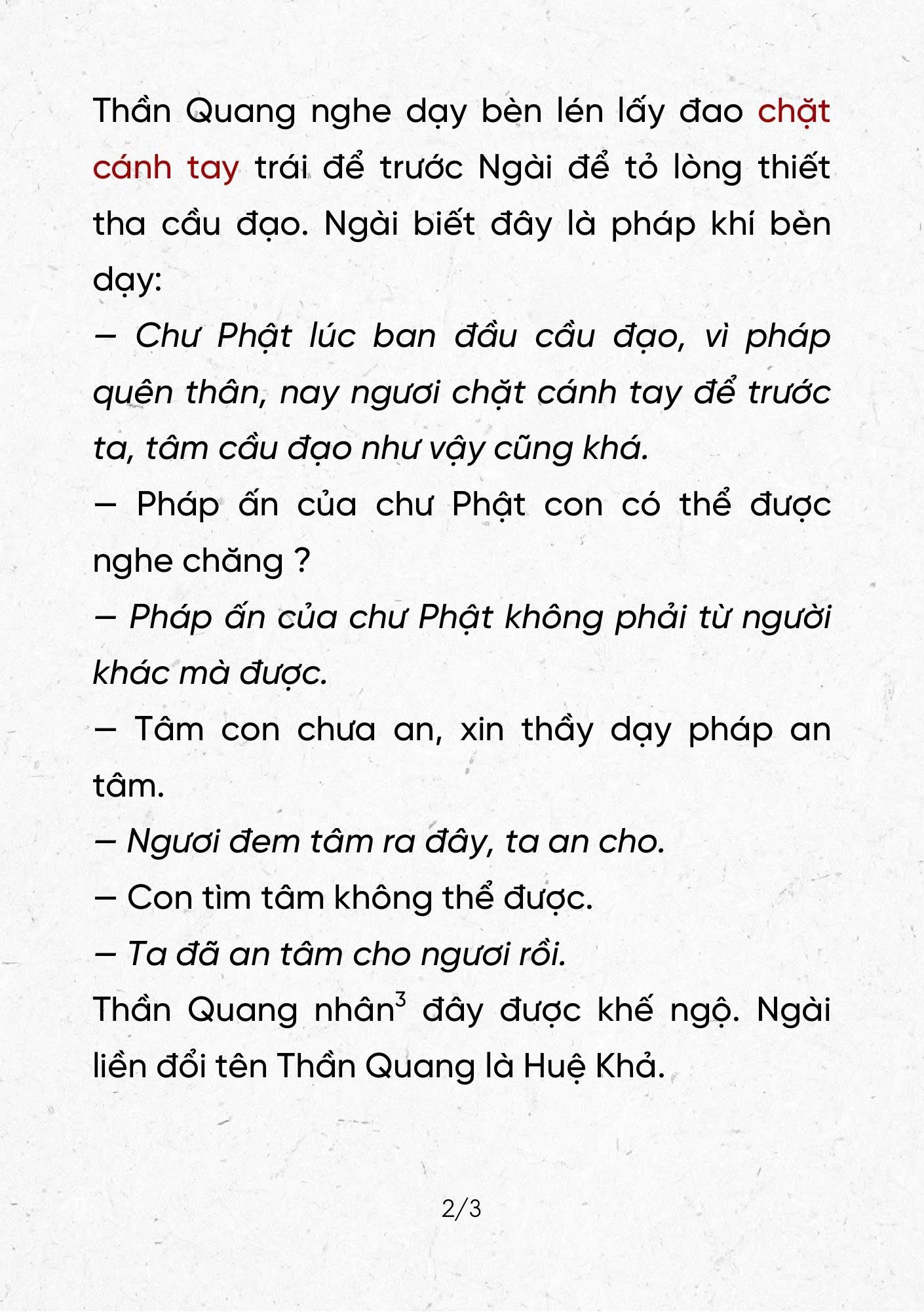 Thần-Quang nghe dạy bèn lén lấy đao chặt cánh tay trái để trước Ngài để tỏ lòng thiết tha cầu đạo.