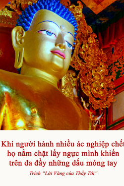 Khi người hành nhiều ác nghiệp chết, họ nắm chặt lấy ngực mình khiến trên da đầy những dấu móng tay. Khi nhớ lại mọi ác hạnh của mình, họ run sợ vì bị tái sinh trong những cõi thấp. Họ tràn đầy hối hận vì đã không thực hành Pháp trong khi có được sự tự do để làm điều đó, bởi đó là điều ích lợi duy nhất vào lúc chết. Khi nhận ra điều đó, họ cảm thấy vô cùng đau khổ. Đó là lý do tại sao họ lại đấm ngực và để lại đầy những dấu móng tay ở đó khi chết.