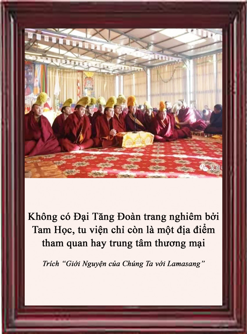 Đạo sư yêu quý và bi mẫn nhất của chúng ta, Lamasang, đã xây dựng nhiều biểu tượng thân, khẩu và ý giác ngộ của Phật, dưới hình thức các ngôi điện thờ, bảo tháp và trung tâm tu học. Nhưng đối với Ngài, đây không phải là những thứ khiến tu viện trở thành tu viện đích thực. Chính những lời dạy của Ngài, chính việc thành lập một Tăng đoàn có học thức, chuyên cần Văn, Tư, Tu theo những đạo lộ của dòng Truyền thừa đã được thiết lập mới đúng là những yếu tố then chốt khiến cho tu viện trở thành tu viện thực sự. Đây chính là sứ mệnh Lamasang tái sinh ở đây, tại nơi đặc biệt này.