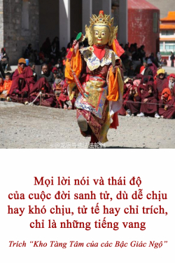 Mọi lời nói và thái độ của cuộc đời sanh tử, dù dễ chịu hay khó chịu, tử tế hay chỉ trích, chỉ là những tiếng vang của tánh Không. Nếu các bạn hét to những lời lăng mạ hay tán dương ở nơi một vách núi rồi những lời ấy vang vọng lại cho các bạn, có lý do gì để cảm thấy thất vọng hay vui mừng? Những âm thanh của vũ trụ – lửa, gió, nước, tiếng kêu của thú, lời nói của người – tất cả đều không có bản tánh thực sự nào. Chúng chỉ là những tiếng vang trống không không thể nắm bắt.