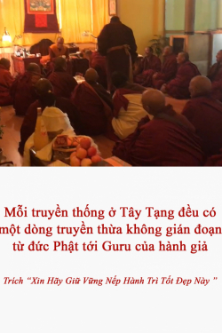 Mỗi truyền thống Phật giáo Tây Tạng đều có một dòng truyền thừa không gián đoạn từ đức Phật tới vị Thầy gốc của hành giả. Điều rất quan trọng là phải có một dòng truyền thừa, các vị đạo sư dòng truyền thừa bởi vì chỉ khi đó mới có lực gia trì, gia hộ từ cội nguồn, từ những bậc như Kim Cang Trì, Guru Rinpoche.