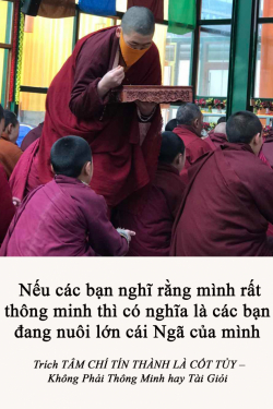 Nếu các bạn nghĩ rằng mình rất thông minh thì có nghĩa là các bạn đang nuôi lớn cái NGÃ của mình. Điều đó có nghĩa là các bạn không có lòng tin, các bạn đang làm suy giảm tâm tín thành đối với Tam Bảo, với giáo lý, với Guru và pháp tu của mình. Khi bạn học quá nhiều, khi các bạn đi đây đó quá nhiều, thấy quá nhiều thứ thì bạn không còn làm việc với cái tâm của mình nữa, mà chỉ đang tạo thêm nhiều nghi ngờ, do dự trong tâm. “Ồ, cái này tốt hơn, cái kia thì không tốt lắm!” Và bạn đánh mất cân bằng nội tại trong tâm. [Khi đó] sẽ có nhiều vọng tưởng nhị nguyên trong tâm hơn [so với nếu] bạn tự giữ mình một cách khiêm hạ.
