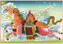 Đạo hữu Hải Losang dịch và giải thích ý nghĩa của vầng mây kiết tường này: đây là một dấu hiệu tuyệt vời rằng công hạnh [của Rinpoche] sẽ tiến triển thuận lợi và đạt thành tựu lớn. Trong văn hóa Phật Giáo Tây Tạng Linh Mã (Ngựa Thiêng Lungta) phi nhanh là dấu hiệu kiết tường, may mắn, dẹp trừ chướng ngại, thành tựu ước nguyện và thịnh vượng.