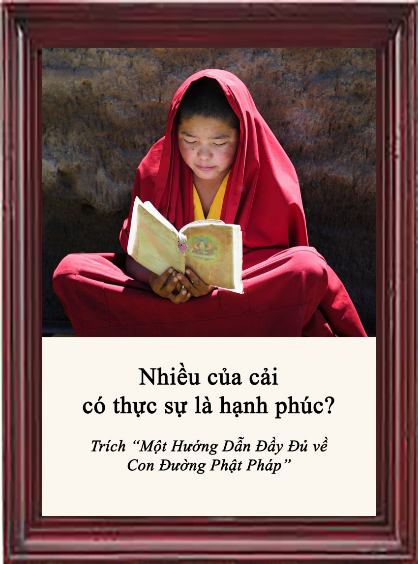 Dĩ nhiên là một số của cải vật chất rất ích lợi, nhưng ta nên truy xét xem chúng có phải là cội gốc đích thực của hạnh phúc hay không. Chẳng hạn như tôi có thể không có một chiếc xe hơi, vì thế tôi muốn có một chiếc. Sau đó tôi nghĩ: “Tôi muốn đi lại tự do và đi bất kỳ nơi đâu mà không tùy thuộc vào người khác.” Mặc dù thế, ngay khi tôi có một chiếc xe hơi, tôi phải lo lắng về việc bảo hiểm và xăng dầu. Và nếu chiếc xe có một vết trầy, tôi sẽ không thích nó. Ta bắt đầu với một nỗi khổ, một chiếc xe hơi, và điều đó lập tức bắt đầu việc tạo lập nhiều nỗi khổ khác. Điều này không có nghĩa là ta không nên sở hữu một chiếc xe hơi, nhưng bao giờ ta còn ở trong sinh tử thì ta không thể tránh được sự không mãn nguyện.