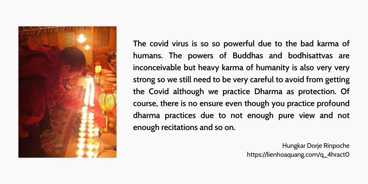“The covid virus is so so powerful due to the bad karma of humans. The powers of Buddhas and bodhisattvas are inconceivable but heavy karma of humanity is also very very strong so we still need to be very careful to avoid from getting the Covid although we practice Dharma as protection. Of course, there is no ensure even though you practice profound dharma practices due to not enough pure view and not enough recitations and so on.”