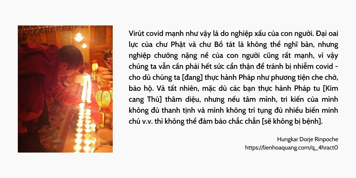 “Virút covid mạnh như vậy là do nghiệp xấu của con người. Đại oai lực của chư Phật và chư Bồ tát là không thể nghĩ bàn, nhưng nghiệp chướng nặng nề của con người cũng rất mạnh, vì vậy chúng ta vẫn cần phải hết sức cẩn thận để tránh bị nhiễm covid - cho dù chúng ta [đang] thực hành Pháp như phương tiện che chở, bảo hộ. Và tất nhiên, mặc dù các bạn thực hành Pháp tu [Kim cang Thủ] thâm diệu, nhưng nếu tâm mình, tri kiến của mình không đủ thanh tịnh và mình không trì tụng đủ nhiều biến minh chú v.v. thì không thể đảm bảo chắc chắn [sẽ không bị bệnh].”