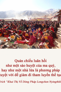 Các Đạo Sư vĩ đại, các bậc đã thành tựu viên mãn, luôn thực sự quán chiếu bản chất của luân hồi. Luân hồi này là đau khổ, nó làm ta mệt mỏi. Bởi vì, không có giải thoát giác ngộ thì ta sẽ lăn lóc trong luân hồi mãi mãi. Luân hồi không đầu, không cuối, nó là bất tận. Do vô thường nên ta sanh ra rồi chết đi, rồi sanh ra chết đi lần nữa, lần nữa.