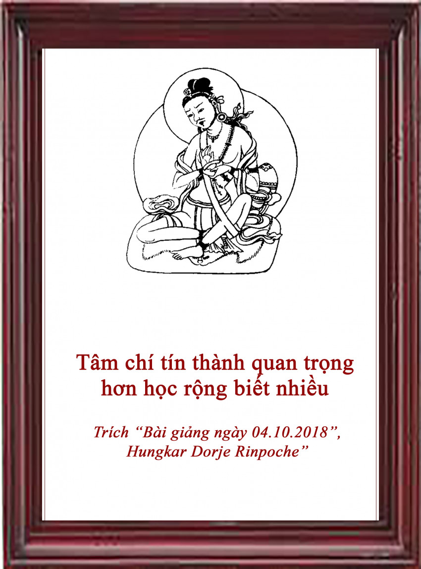 Khi đọc tiểu sử các vị Tổ chúng ta sẽ thấy được tâm chí tín thành quan trọng hơn kiến thức, sự hiểu biết. Nếu không có tâm chí tín thành thì chúng ta sẽ không thể nào đạt tới chứng ngộ, không thể nào đắc đạo. Một ví dụ điển hình là câu chuyện về Ngài Naropa. Ngài Naropa nổi tiếng là vị Pháp sư, một vị học giả học rộng biết nhiều về Pháp. Nhưng tự kiểm chứng bản thân thì Ngài không hài lòng vì Ngài không chứng ngộ, chưa đắc đạo, mà chỉ là người có hiểu biết thôi. Ngài đã tầm sư học đạo với Tổ Tilopa. Tổ Tilopa chẳng dạy gì nhiều mà chỉ nhấn mạnh về tâm chí tín thành, và hàng ngày Tổ Tilopa kiểm tra Naropa xem lòng thành của đệ tử hôm nay tới đâu rồi. Nhờ như vậy mà dần dần Ngài Naropa mới phát triển được tâm chí tín thành. Còn trước đó chính Tổ Tilopa đã nói với Naropa: Ông chỉ biết nhiều, học rộng nhưng ông có lòng tin nơi ta đâu. Và như vậy tâm chí thành, chí tín đối với Guru của Naropa phát triển tới mức Ngài không bao giờ phân vân do dự, luôn sẵn sàng làm bất cứ điều gì mà thầy mình chỉ dạy.