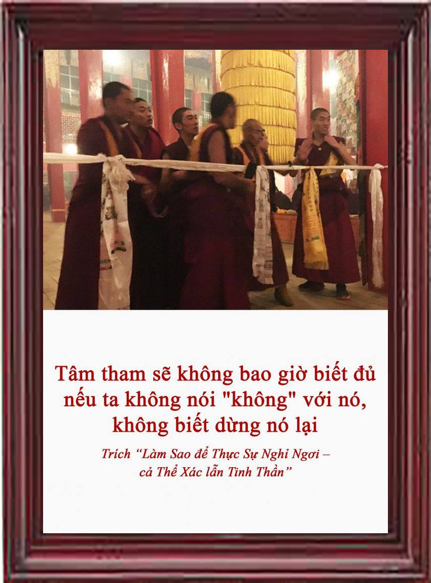 Đức Phật dạy phải biết ‘thiểu dục tri túc’ - phải biết hài lòng với những gì mà mình có được. Đó là điều rất quan trọng. Bởi vì bản chất tâm của chúng ta là tham, và lòng tham này sẽ vô bờ bến. Nếu ta không thực sự nói ‘KHÔNG’ với nó và dừng nó lại thì nó sẽ không bao giờ dừng lại được. Nếu ta để cho tâm mình được tự do thì nó sẽ đuổi theo bất cứ cái gì nó tóm được. Vì thế, đức Phật và các bậc đạo sư vĩ đại trong quá khứ luôn dạy rằng những bận tâm thế tục sẽ không bao giờ hết, trừ khi ta quyết tâm dừng chúng lại.