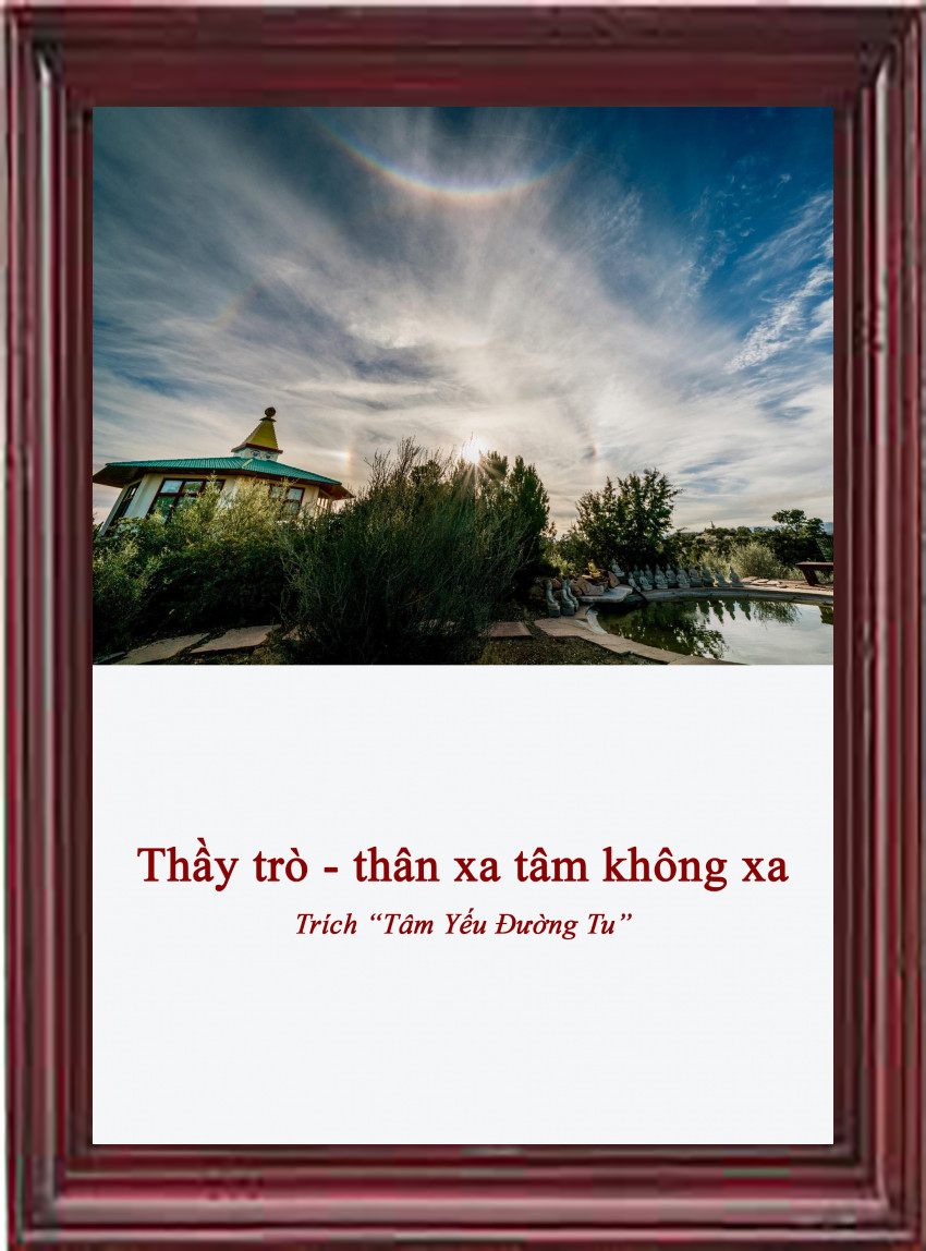 Chẳng hạn như con là đệ tử của thầy và con hành trì ở Việt Nam, thầy thì công phu bên Mỹ. Nếu con tu và ta cũng tu thì tuy thân xác chúng ta xa nhau nhưng tâm lại là một, rất gần nhau. Gần nhau giống như hòa làm một. Cũng như trên trái đất này có rất nhiều nguồn nước khác nhau nhưng đều có chung một tên gọi là “nước”. Mỗi khi con nghĩ về Guru của mình với tâm chí thành, chí tín thì tâm con sẽ hợp nhất với tâm của đạo sư. Tâm của chúng ta giống như tấm gương soi phản ảnh tất cả những gì ta suy nghĩ trong đầu. Nếu tâm của ta nghĩ đến Guru thì tự khắc ta sẽ nối tâm được với ngài. Khi không có cơ duyên được gặp gỡ thường xuyên với vị Guru của mình thì chúng ta có thể gặp gỡ các vị đạo sư khác và cũng sẽ có được lợi lạc từ các vị ấy vì thật ra tâm của các ngài đều như nhau.
