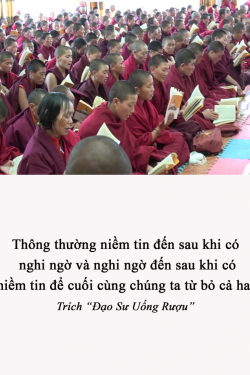 Một khi bạn đã bắt đầu trên con đường thực hành Kim Cương thừa, rất nhiều chuyện có thể xảy ra, và bạn phải chuẩn bị đón nhận. Có được đức tin là rất quan trọng, nhưng biết nghi ngờ và biết dùng lý lẽ cũng rất tốt. Thông thường, niềm tin đến sau khi có nghi ngờ và nghi ngờ đến sau khi có niềm tin. Và thường điều đến sau lại mạnh mẽ hơn rất nhiều. Cuối cùng, chúng ta phải từ bỏ cả hai điều ấy.