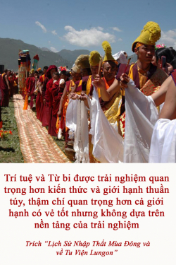 Trí tuệ và từ bi được trải nghiệm quan trọng hơn kiến thức và giới hạnh thuần túy, thậm chí [quan trọng hơn] cả giới hạnh có vẻ tốt nhưng không dựa trên nền tảng của trải nghiệm. TRẢI NGHIỆM một cái gì đó trong Pháp (Dharma) đến từ TU hành THẬT.
