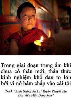 "Sau khi chúng ta chết đi và đi vào giai đoạn trung ấm, chúng ta không còn thân vật lý nữa. Chừng nào thần thức chưa có thân mới thì nó vẫn có bốn uẩn còn lại, đó là thọ uẩn, tưởng uẩn, hành uẩn và thức uẩn. Do bởi các dấu ấn nghiệp trong tâm, thần thức kinh nghiệm khổ đau to lớn bởi vì nó bám chấp vào cái tôi. Bốn uẩn kia lúc đó cũng giống hệt như chúng lúc bây giờ mặc dù chúng ta lúc đó đã không còn thân vật lý, nhưng vẫn có sự bám chấp vào thân."
