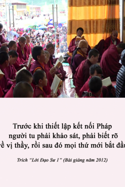 Kết nối nghiệp quyết định ai là Guru của bạn. Kết nối nghiệp rất quan trọng. Nói chung, có rất nhiều yêu cầu về một vị Kim cang Thượng sư. Một vị đạo sư phải có nhiều phẩm hạnh. Người đó phải đạt những tiêu chuẩn được mô tả trong kinh sách. Nếu muốn tìm bậc chân sư hãy khảo sát các phẩm hạnh nơi người thầy. Xem người đó có thông tuệ giáo lý không, có từ bi và trung thực hay không. Người đó đối nhân xử thế có đúng Pháp không, hay luôn việc trái. Chúng ta cần phải biết nhiều điều khác nhau có liên quan tới vị thầy đó.