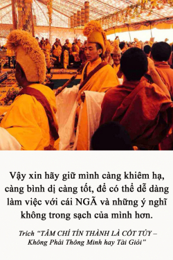 Thầy thấy nhiều người chạy khắp nơi, chỗ này chỗ nọ, khắp ba thời mười phương (Rinpoche cười). Đồng thời họ tạo nên đủ thứ rắc rối, phiền não ở mười phương. Theo Thầy tâm họ tán loạn khắp nơi và họ không biết trụ tâm mình vào đâu nữa. Đó là một tai họa lớn. Thầy có nhiều kinh nghiệm [về vấn đề này]. Vậy xin hãy giữ mình càng khiêm hạ, càng bình dị càng tốt, để có thể dễ dàng làm việc với cái NGÃ và những ý nghĩ không trong sạch của mình hơn.