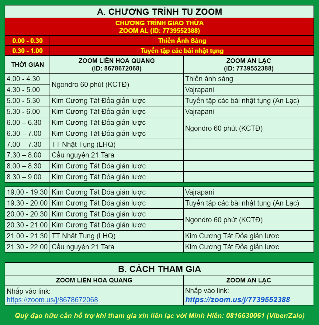 1. Tất cả các chương trình tu ZOOM của An Lạc và Liên Hoa Quang TRONG DỊP TẾT không thay đổi.