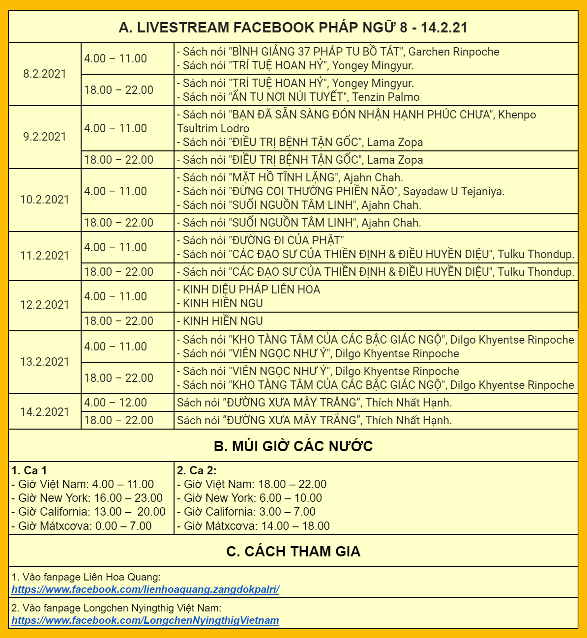 2. GIAO THỪA: từ 0.00 tới 1.00 (ngày mồng 1 Tết VN và Losar): cầu nguyện và trì tụng minh chú qua ZOOM.