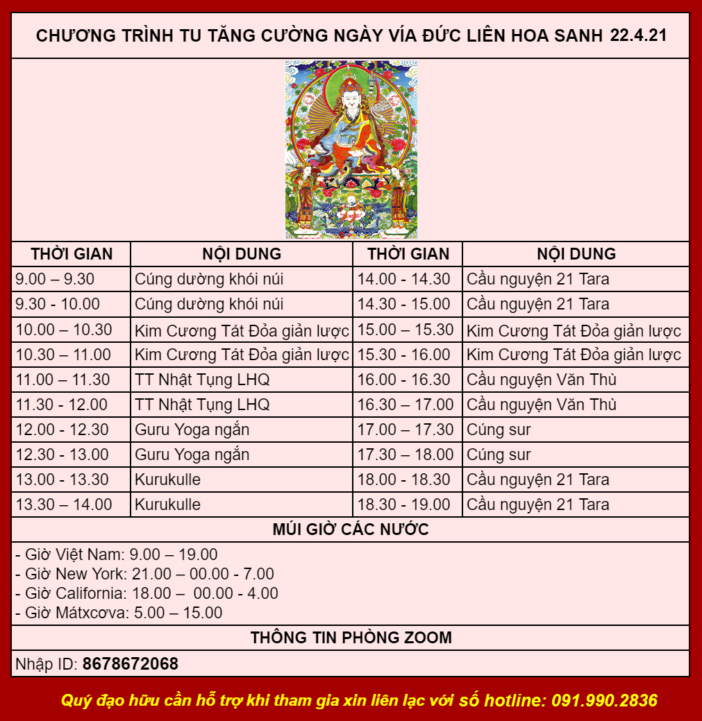 Ngày 22.4.2021 là vía đức Liên Hoa Sanh (10.3 TL), công đức tăng trưởng trăm lần. LHQ xin gửi tới quý đạo hữu chương trình tu tăng cường Zoom Liên Hoa Quang (ID: 8678672068).