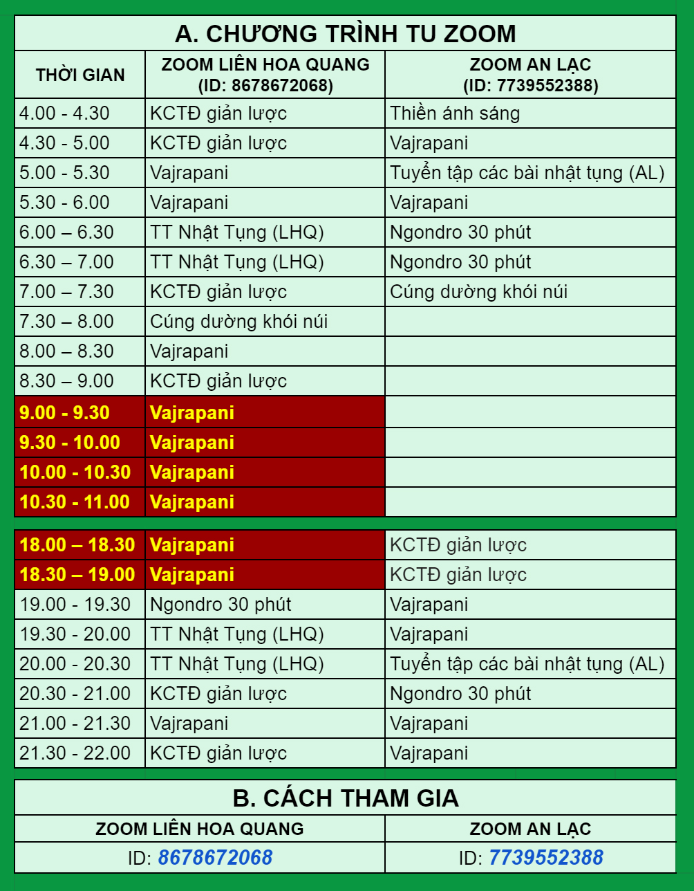 BBT LHQ xin gửi lại các thời khóa tu hàng ngày của ZOOM Liên Hoa Quang (ID: 8678672068) & ZOOM An Lạc (7739552388) để quý đạo hữu tiện theo dõi.