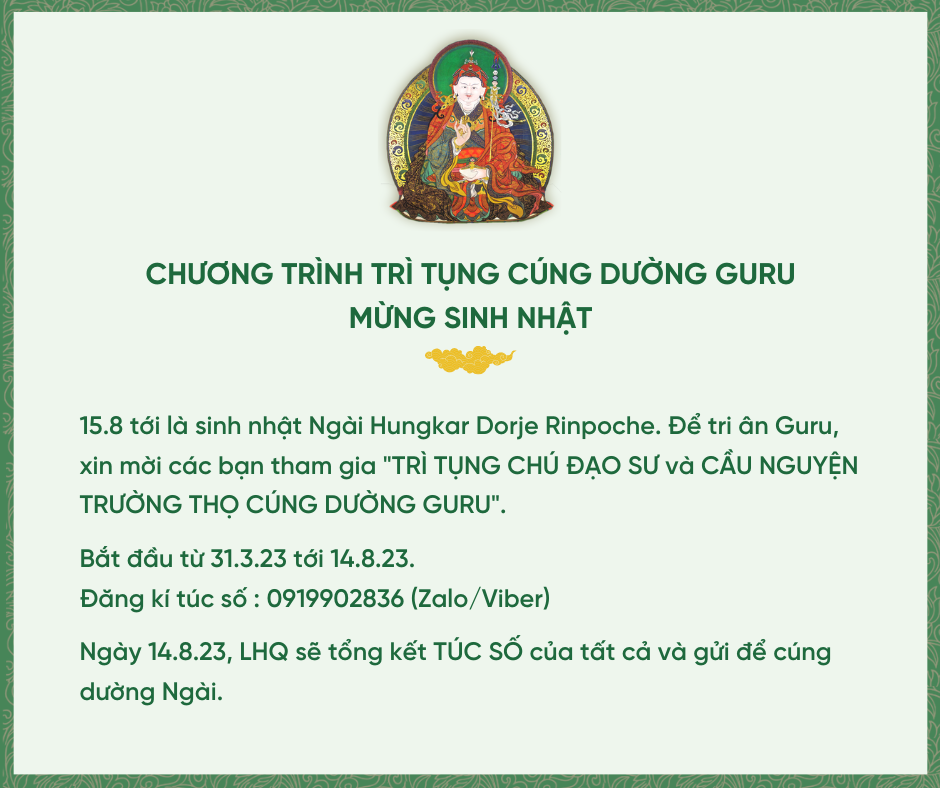 Ngày 15 tháng 8 tới là sinh nhật Thầy, Ngài Hungkar Dorje Rinpoche. Để tri ân Thầy, Liên Hoa Quang xin mời các bạn tham gia chương trình TRÌ TỤNG CHÚ ĐẠO SƯ và CẦU NGUYỆN TRƯỜNG THỌ CÚNG DƯỜNG GURU.