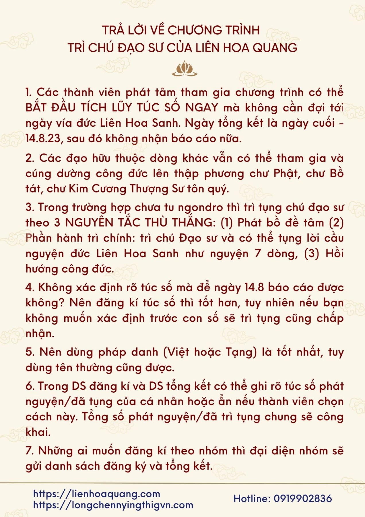 Chương trình bắt đầu từ 31.3, ngày vía đức Liên Hoa Sanh, và kết thúc ngày 14.8.23. LHQ sẽ tổng kết TÚC SỐ của tất cả và gửi danh sách cho Thầy và mọi người để cúng dường Ngài.