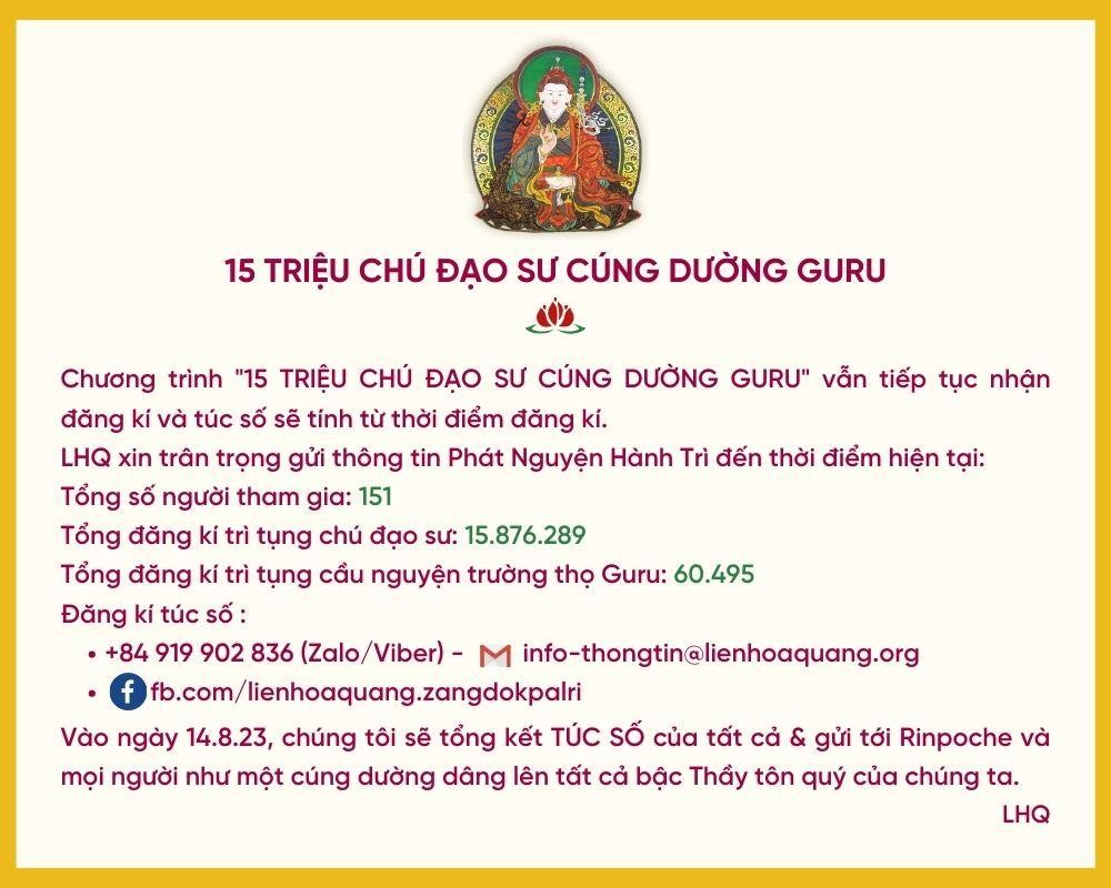 A. Chương trình "15 TRIỆU CHÚ ĐẠO SƯ CÚNG DƯỜNG GURU" (bắt đầu từ 31.3 đến 14.8.23) vẫn tiếp tục nhận đăng kí và túc số sẽ tính từ thời điểm đăng kí.