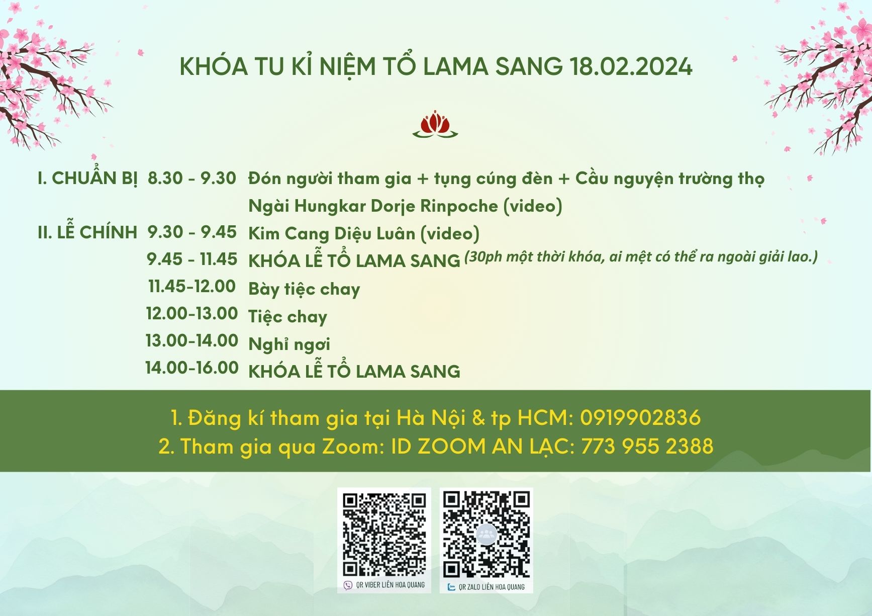 Chủ nhật 18.2, là ngày Kỉ niệm Lama Sang. Để cùng hướng tâm về Tổ, về dòng truyền thừa, về Đức Bổn sư, để nghĩ tưởng tới công đức, hạnh nguyện bất khả tư nghì của các Ngài mà phát tâm tinh tấn tu tập, LHQ xin kính mời quý đạo hữu gần xa cùng tham gia KHÓA TU KỈ NIỆM LAMA SANG do An Lạc - Liên Hoa Quang thực hiện.