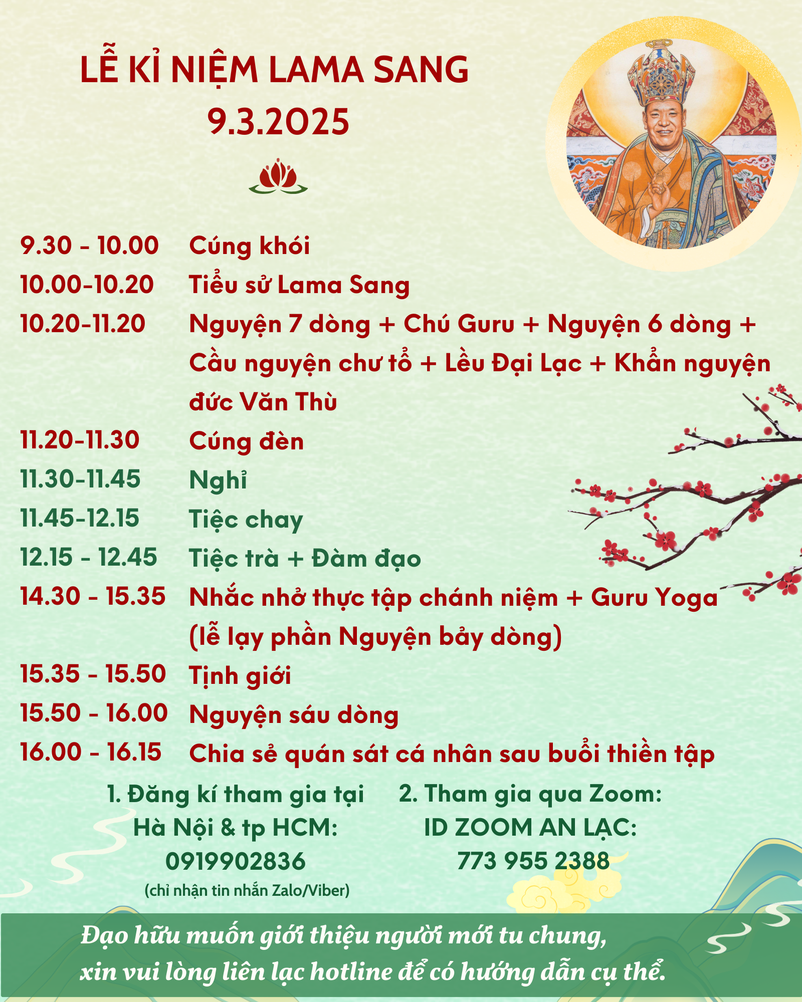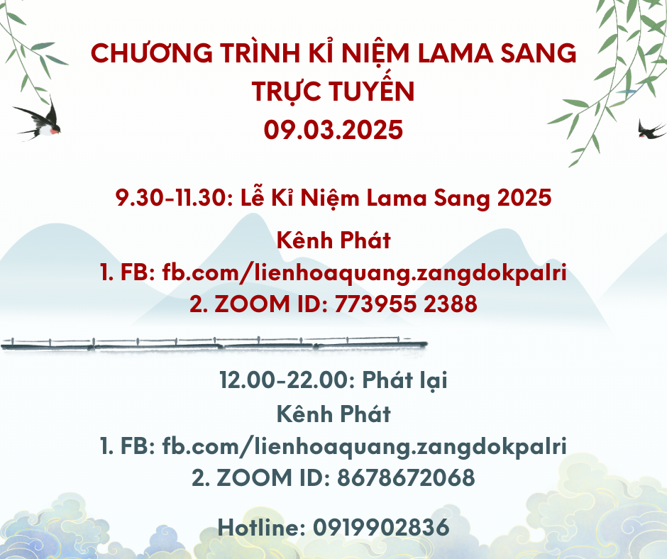 Liên Hoa Quang kính mời quý đạo hữu gần xa cùng tham gia LỄ KỈ NIỆM LAMA SANG do An Lạc - Liên Hoa Quang thực hiện để cùng hướng tâm về chư Tổ dòng truyền thừa và nghĩ tưởng đến công đức, hạnh nguyện bất khả tư nghì của các Ngài: