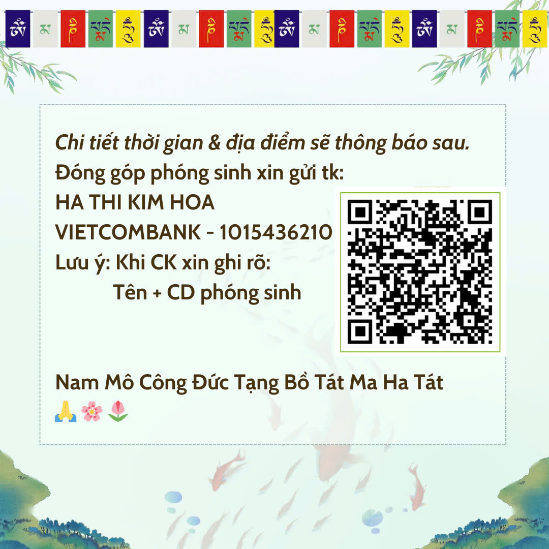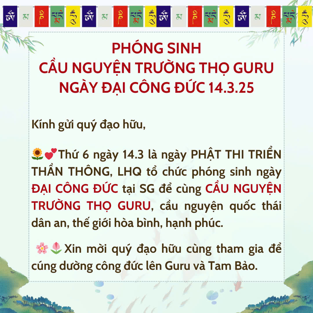 Thứ 6 ngày 14.3 tới đây là ngày PHẬT THI TRIỂN THẦN THÔNG, Liên Hoa Quang tổ chức phóng sinh ngày ĐẠI CÔNG ĐỨC tại SG để cùng CẦU NGUYỆN TRƯỜNG THỌ GURU, cầu nguyện quốc thái dân an, thế giới hòa bình, hạnh phúc.